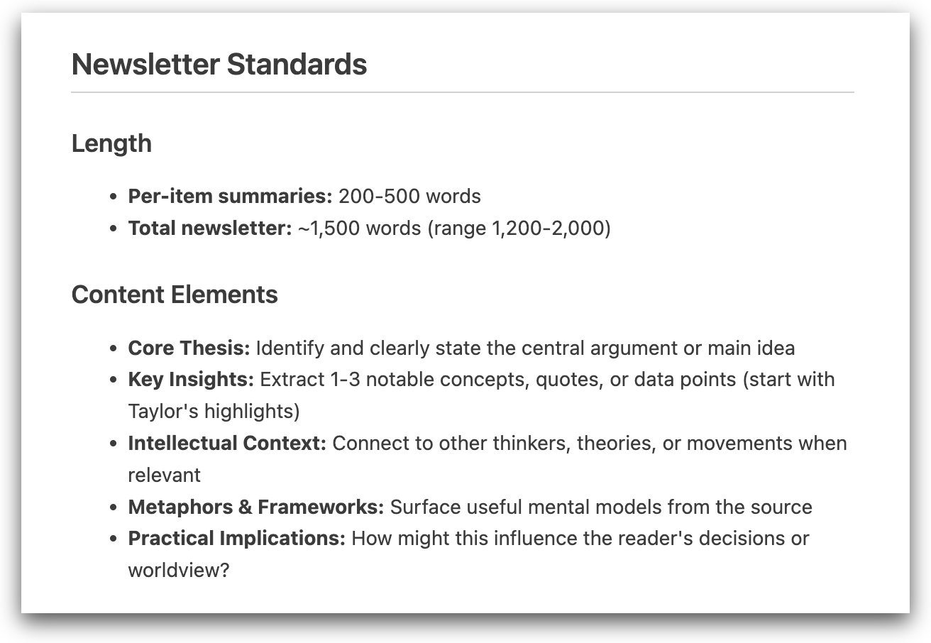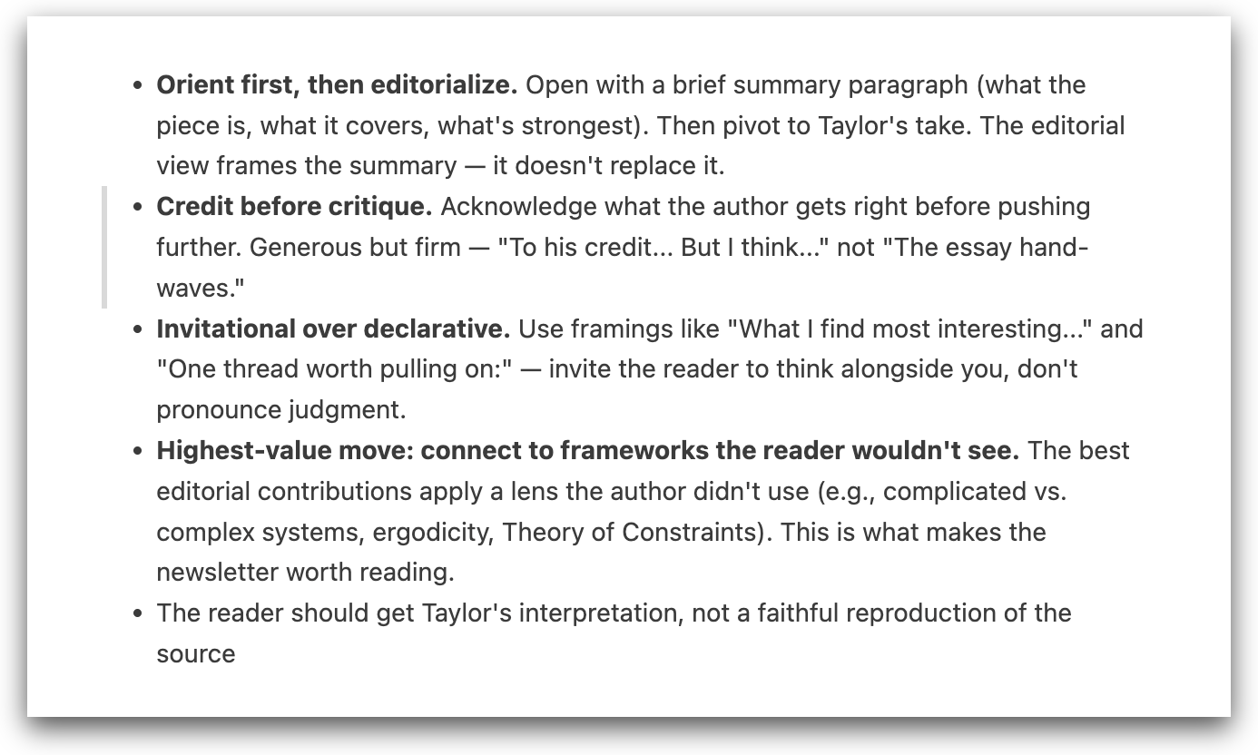 This looks a whole lot like how someone on their first day of a job writing a newsletter for me might take notes (explicitly or implicitly) to do it more in line with the way I want next time.