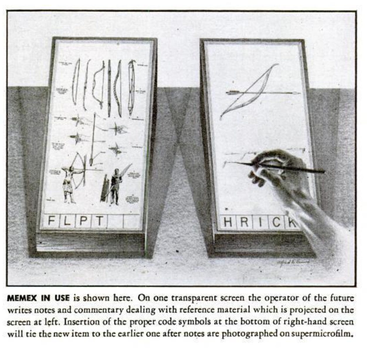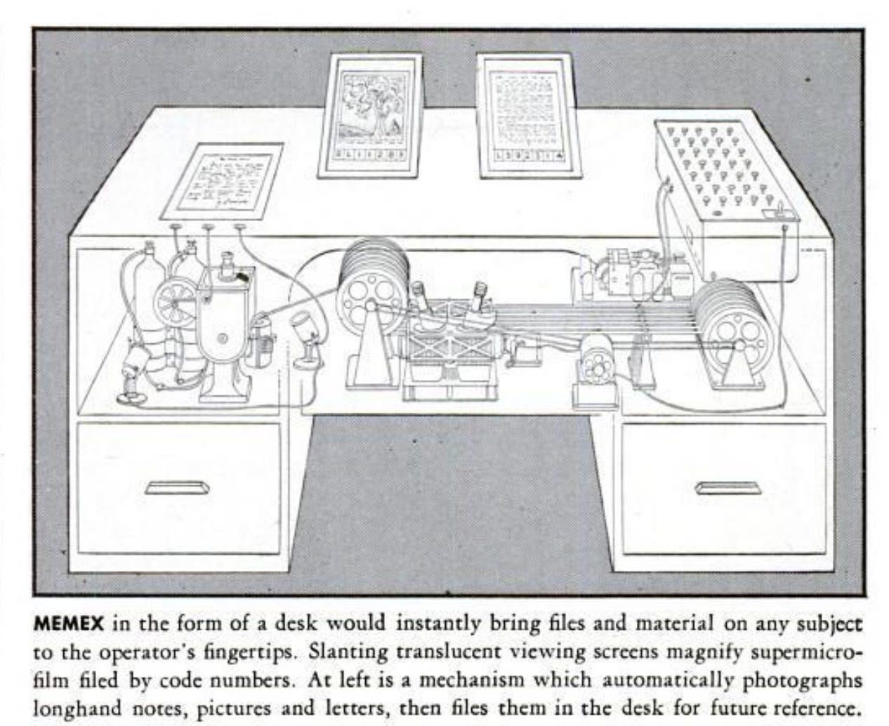 Bush proposed a machine he called the “memex” — a desk-sized device that would combine lower level technologies to achieve a higher level of organized knowledge (like human memory processes). The memex could store all of a person’s books, records, and communications on microfilm and allow them to build connections that would lead to new discoveries.