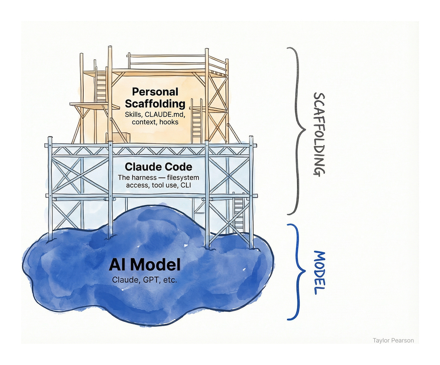You give her brand guidelines, a style doc, and the last six months of campaign performance. That’s the context-specific ‘harness’ — that shapes her general skills into something useful in that particular situation.