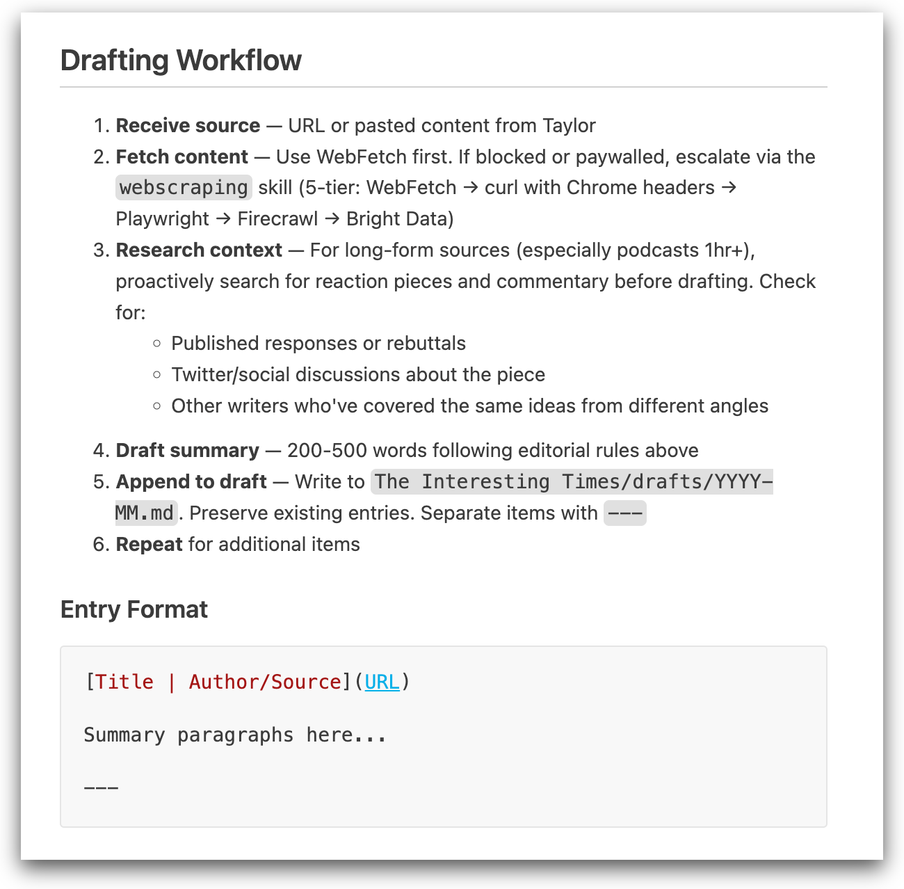 I have a set of instructions (called a Skill file in Claude Code) to help me write a monthly newsletter. The AI model uses the instructions in this file like someone at your company might use a standard operating procedure.